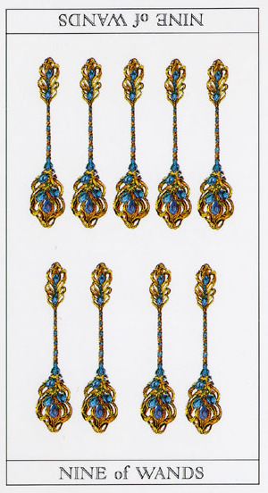 The 9 represents rest after work, which is another thing (like 8) that the element Fire associated with Wands is not very comfortable with. Fire likes to keep going. This rest will probably be spent thinking about what to do next along the course to completion.