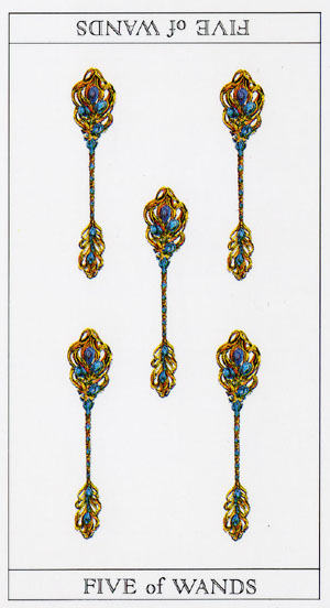 The 5 of Wands represents competition. The 5 is the second assignment number, and therefore a difficult card. 5 combined with the Wand's element fire challenges you. You'll have to fight hard for your idea, but you stand a good chance of succeeding.