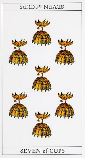 The 7 of Cups is about making a choice between different ideals. But Cups, with the water element, don't like making definitive choices that much, making this 7 in this suit a bit of a hard choice.
