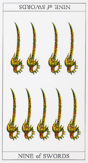 The 9 of Swords represents relief from cropped-up grief. The number 9 is a number of reward and rest and accomplishment. In the element of Swords there is not a lot of time for rest, but without any rest you'd just burn yourself out.
