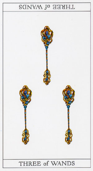 This card is about exposing your new ideas to the world. The Wand's element fire goes well with the number 3, as 3 is an output number, a number of results. Fire likes getting to results quickly.