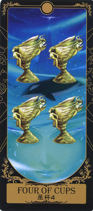With the 4, the second cycle of this suit is commenced, where a choice between structure and feeling has to be made, where old securities have to be let go of to work towards a new future. But like Wands, Cups don't like structure much, they prefer to be free and dream rather than to make commitments and go for something.