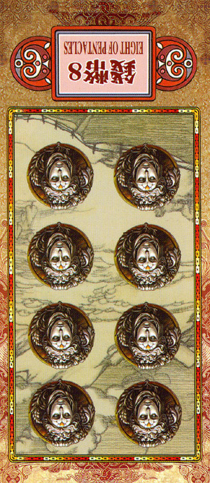 The 8 of Pentacles is about keeping up the hard work you're doing, and trying to be happy about doing that work at the same time. While the 3 of Pentacles is about completing a masterpiece, the 8 of Pentacles is about doing the apprentice work that makes you a master of your trade.
