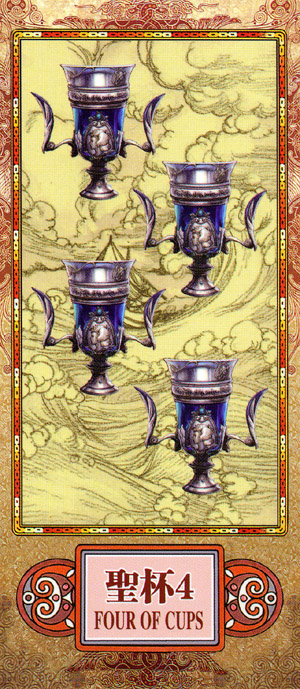 With the 4, the second cycle of this suit is commenced, where a choice between structure and feeling has to be made, where old securities have to be let go of to work towards a new future. But like Wands, Cups don't like structure much, they prefer to be free and dream rather than to make commitments and go for something.