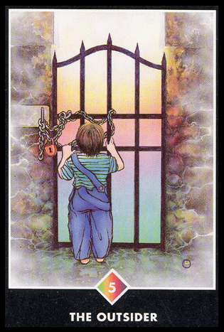 The 5 of Pentacles is an assignment-number card, and is about letting go of your securities. Pentacles element Earth (also) represents material posessions, so this card is about letting go of (some of) your worldly assets.