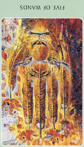 The 5 of Wands represents competition. The 5 is the second assignment number, and therefore a difficult card. 5 combined with the Wand's element fire challenges you. You'll have to fight hard for your idea, but you stand a good chance of succeeding.