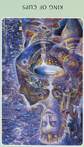 The King of Cups uses his intuition to achieve his ideals. Since Cups are turned inward, and Kings turned to the outside world, this card might be a difficult one, or it could be a powerful one.