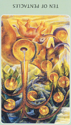 The 10 of Pentacles represents material posessions. The number 10 of Pentacles forms the links to the Ace (first card) of Wands (the first suit in the minor Arcana), and thus prepares to bring you back to the beginning of the minor Arcana, ready for a next cycle through the tarot.