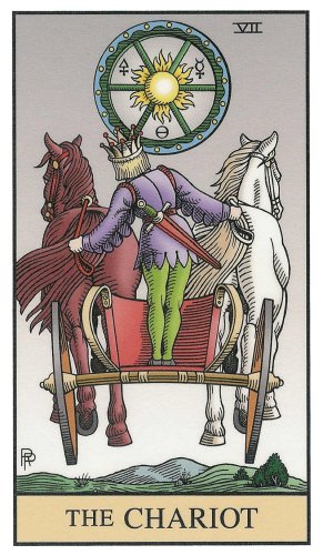 During the prevous card, The Lovers, all the wisdom of the first cards in the deck has been processed and a choice was made for personal growth. Now it's time to do something with all this baggage, to actually travel the road. A lot has been done so far, wisdoms have been accumulated and integrated into one's personality.