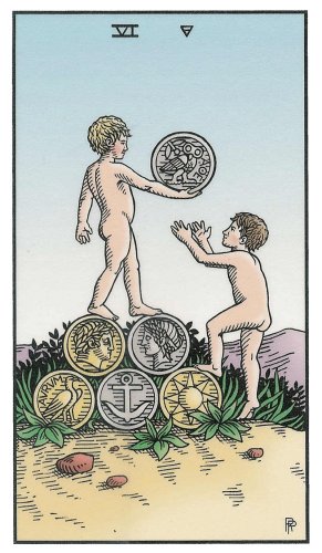 The 6 of Pentacles signals that help has arrived or will arrive soon. The number 6 represents security and reward. In the Earth element attached to Pentacles, this means material rewards are likely coming your way.