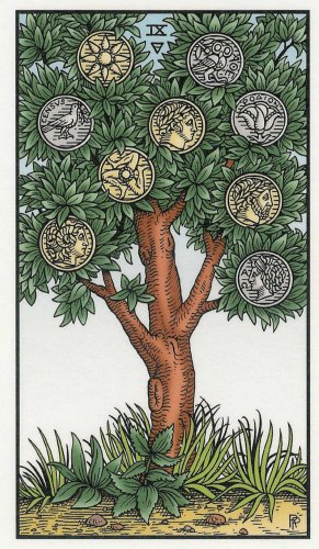 The 9 of Pentacles represents earned rest. The element Earth, attached to the Pentacles suit, appreciates the rest that completion of hard work brings. This is a good time for games and relaxation.