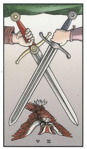 The 2 is an assignment number in tarot, and in this case of the 2 of Swords, it's about being forced to wait for something, often even while blindfolded in some sense.