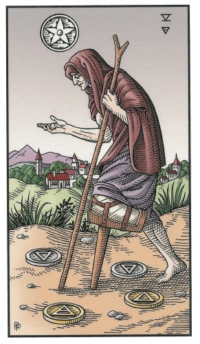 The 5 of Pentacles is an assignment-number card, and is about letting go of your securities. Pentacles element Earth (also) represents material posessions, so this card is about letting go of (some of) your worldly assets.