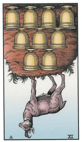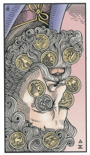 The 10 of Pentacles represents material posessions. The number 10 of Pentacles forms the links to the Ace (first card) of Wands (the first suit in the minor Arcana), and thus prepares to bring you back to the beginning of the minor Arcana, ready for a next cycle through the tarot.
