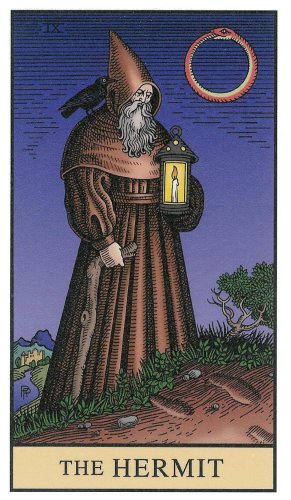 The Hermit shuts out the world and retreats into solitude to better understand some spiritual aspect of life. He opens to the cosmos and lets it's wisdom sink in. Hermits are often seen as wise old men who can guide a traveller along a journey.