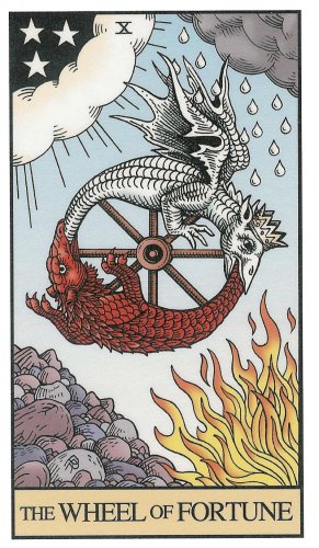 With the Wheel of Fortune, the second major cycle of Tarot commences. The first cycle in the first cards of the deck was about development as a child, accumulating wisdoms and integrating them into your personality. This second cycle is about your development as an adult. It is a more demanding cycle. You'll have to see if you can face what the world throws at you.