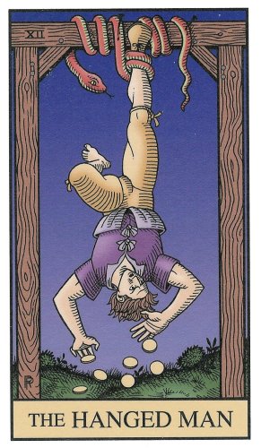 First you learned that you're not a plaything of fate, that you can make your own choices. Then you've learned how to fend for yourself and face yourself. Now, at The Hanged Man, you can learn to let go. You no longer have to cling to old values. You've found strength in yourself and by letting go, you allow growth.