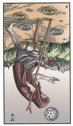 The 5 of Pentacles is an assignment-number card, and is about letting go of your securities. Pentacles element Earth (also) represents material posessions, so this card is about letting go of (some of) your worldly assets.