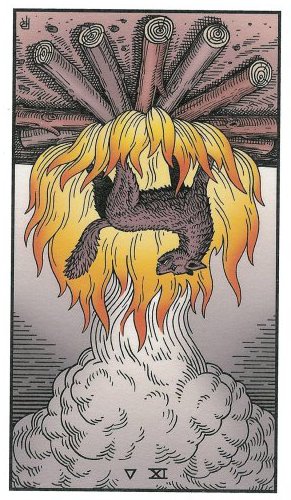 The 9 represents rest after work, which is another thing (like 8) that the element Fire associated with Wands is not very comfortable with. Fire likes to keep going. This rest will probably be spent thinking about what to do next along the course to completion.