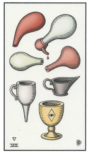 The 7 of Cups is about making a choice between different ideals. But Cups, with the water element, don't like making definitive choices that much, making this 7 in this suit a bit of a hard choice.
