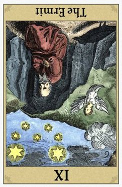The Hermit shuts out the world and retreats into solitude to better understand some spiritual aspect of life. He opens to the cosmos and lets it's wisdom sink in. Hermits are often seen as wise old men who can guide a traveller along a journey.