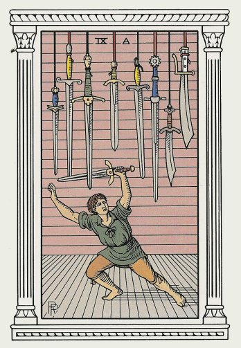 The 9 of Swords represents relief from cropped-up grief. The number 9 is a number of reward and rest and accomplishment. In the element of Swords there is not a lot of time for rest, but without any rest you'd just burn yourself out.