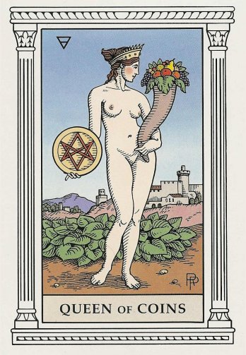 The Queen in the suit of Pentacles becomes aware of her Earthly attributes; she's reliable and sober, able to give good advice.