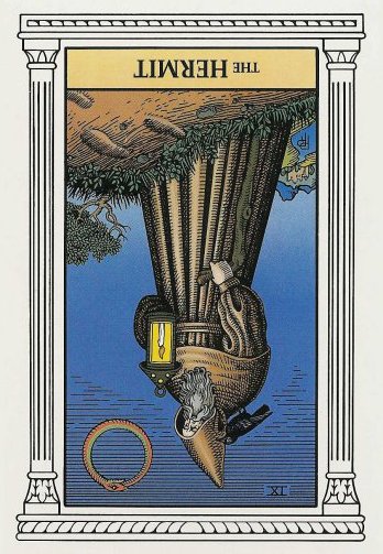 The Hermit shuts out the world and retreats into solitude to better understand some spiritual aspect of life. He opens to the cosmos and lets it's wisdom sink in. Hermits are often seen as wise old men who can guide a traveller along a journey.