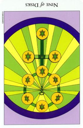 The 9 of Pentacles represents earned rest. The element Earth, attached to the Pentacles suit, appreciates the rest that completion of hard work brings. This is a good time for games and relaxation.