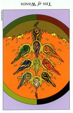 The 10 of Wands is therefore the transition from the element Fire (associated with Wands) to the element Water, associated with Cups. As you might imagine, this not the easiest of transitions.