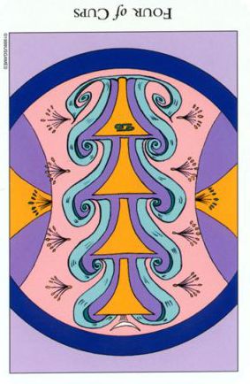 With the 4, the second cycle of this suit is commenced, where a choice between structure and feeling has to be made, where old securities have to be let go of to work towards a new future. But like Wands, Cups don't like structure much, they prefer to be free and dream rather than to make commitments and go for something.