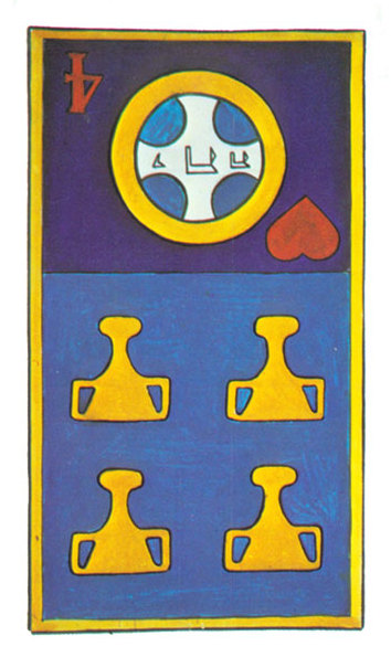With the 4, the second cycle of this suit is commenced, where a choice between structure and feeling has to be made, where old securities have to be let go of to work towards a new future. But like Wands, Cups don't like structure much, they prefer to be free and dream rather than to make commitments and go for something.