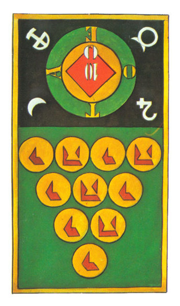 The 10 of Pentacles represents material posessions. The number 10 of Pentacles forms the links to the Ace (first card) of Wands (the first suit in the minor Arcana), and thus prepares to bring you back to the beginning of the minor Arcana, ready for a next cycle through the tarot.