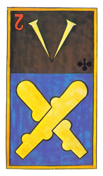 The 2 of Wands represents the research and digestion of a new idea. The number of this card and it's element are somewhat in conflict; while the 2 is focussed inwards, the Wand's element fire is outgoing. Fire wants to steam ahead while the blackbox 2 asks for patience.