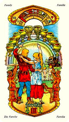 The 10 of Cups is the link to the Swords suit. It is time to leave your own emotions behind and face the world and the tasks ahead.
