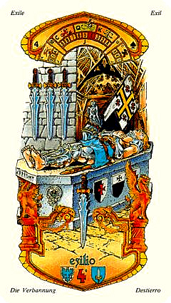 4 is the first number in the cycle of giving things shape. It's about making things real. The element of Swords also relates to making things real, so this enhances the effect so much that arrogance can cause you to exhaust yourself.