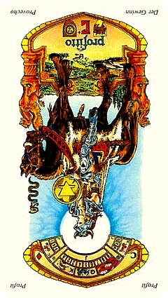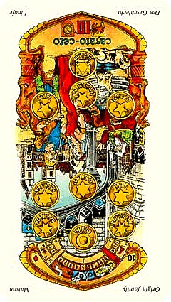 The 10 of Pentacles represents material posessions. The number 10 of Pentacles forms the links to the Ace (first card) of Wands (the first suit in the minor Arcana), and thus prepares to bring you back to the beginning of the minor Arcana, ready for a next cycle through the tarot.
