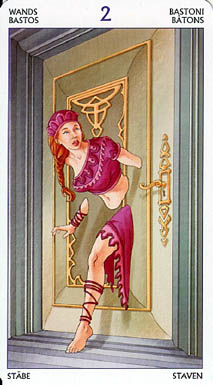 The 2 of Wands represents the research and digestion of a new idea. The number of this card and it's element are somewhat in conflict; while the 2 is focussed inwards, the Wand's element fire is outgoing. Fire wants to steam ahead while the blackbox 2 asks for patience.