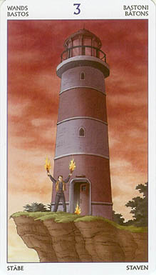 This card is about exposing your new ideas to the world. The Wand's element fire goes well with the number 3, as 3 is an output number, a number of results. Fire likes getting to results quickly.