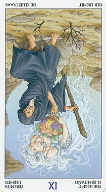The Hermit shuts out the world and retreats into solitude to better understand some spiritual aspect of life. He opens to the cosmos and lets it's wisdom sink in. Hermits are often seen as wise old men who can guide a traveller along a journey.