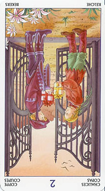 This the first assignment number of the Cups suit. Unlike Wands, with the Fire element, Cups, with the water element, has a lot more patience. Water is by nature more introspective, and this second card in the Cups suit is indeed about exploring yourself. The outcome is uncertain as always, but it usually results in better acceptance of yourself.