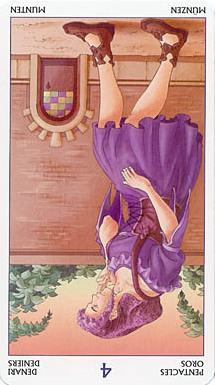 The 4 of Pentacles is about holding on to what you got. The number 4 represents structure and order, and fits well with the suit's element, Earth.