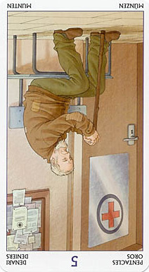 The 5 of Pentacles is an assignment-number card, and is about letting go of your securities. Pentacles element Earth (also) represents material posessions, so this card is about letting go of (some of) your worldly assets.