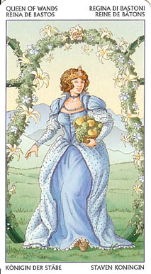 The Queen of Wands is drawn when you (have to) become more aware of the properties of the Wands suit; vitality, optimism and enthousiasm.