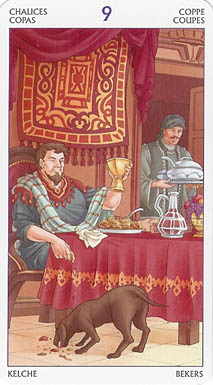 The 9 of Cups represents achievement and contentment. It is an excellent time to take some rest and enjoy yourself.