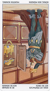 The King of Pentacles uses his Earthly attributes to rule. He goes about his work like an old style business man; he avoids unnecessary risks, aims for real results, and acts from confidence.