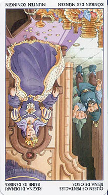The Queen in the suit of Pentacles becomes aware of her Earthly attributes; she's reliable and sober, able to give good advice.