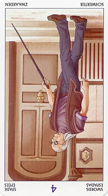 4 is the first number in the cycle of giving things shape. It's about making things real. The element of Swords also relates to making things real, so this enhances the effect so much that arrogance can cause you to exhaust yourself.