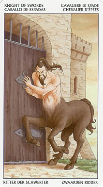 The Knight of Swords lacks the naivety of the Knight of Wands, he has analyzed the terrain ahead and weighed his options there. He knows what his own nature can throw into the mix, but does not let himself be held idle by that. The activities ahead will likely include the solving of conflicts and problems on your road to your ideal.