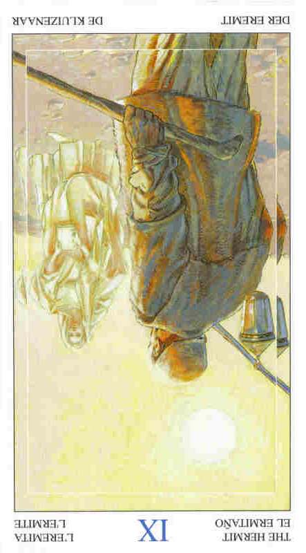The Hermit carries the number 9. This is the highest base number. After 9 the composed numbers emerge. Therefore the number 9 is the gateway to a higher order. It is also a place to rest before embarking on the next leg of the journey.